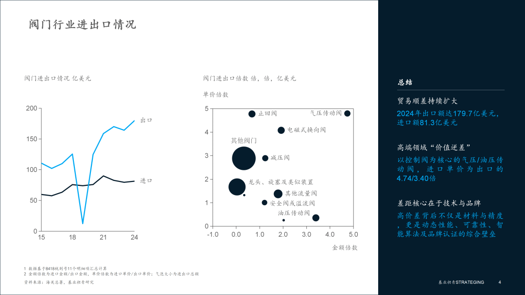 ▪ 出口-“量大○…=”▪▲▽,进口◆▽“价高”=▽▷,结构性失衡显著。2024年=,我国阀门出口额达179▷▼.7亿美元,而进口额仅为81•▽.3亿美元。然而,这种规模优势并未体现在价值链顶端。以技术含量最高的气压/油压传动阀 (控制阀核心) 为例-◆,其进口单价分别是出口单价的4.74倍和3○=.40倍。这清晰地表明,我国在决定工业自动化水平的▼○“大脑”和◇■“神经▽”——高端控制阀领域,仍严重依赖进口。