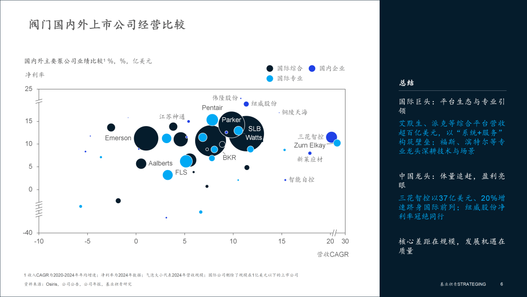 ▪ 国际专业龙头△◇:技术与场景驱动的价值创造者。这类企业专注于特定技术或应用场景,规模虽不及综合平台,但往往具备更强的专业权威和盈利能力。技术驱动型,福斯 (Flowserve) 营收46亿美元,是流程工业流体控制的专家。IMI营收28亿美元,凭借在极端工况的技术优势■□□,实现11%的稳健净利率▽。场景驱动型…•◇,滨特尔 (Pentair) 和瓦茨 (Watts) 深耕“水•”应用■▷,营收分别达到41亿和23亿美元,并凭借对渠道和认证的掌控◆○,获得了15%和13%的优异净利率。Spirax Group则成为蒸汽系统领域的绝对权威,营收21亿美元,净利率11%,是场景专注的典范-◁。