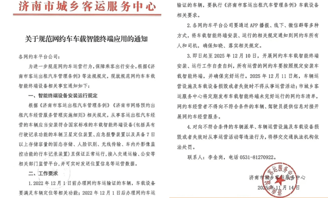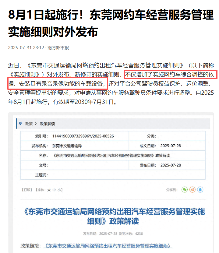 其实不止济南,现在全国对网约车行业的监管都越来越严◆▪●,很多城市都在通过规范营运设备,把不合规、不安全的车辆挡在门外☆。2025年7 月底,东莞也通过新修订的《网络预约出租汽车经营服务管理实施细则》,明确要求网约车安装具有录音录像功能的车载设备•★,和济南一样,设备记录的音视频数据既能保护驾乘双方权益,也能为监管部门提供运营核查依据。