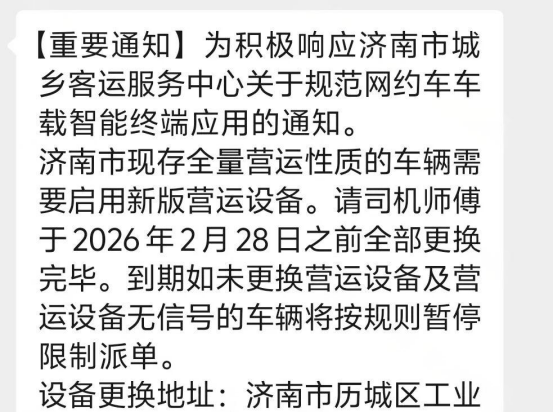 这几天,济南各网约车平台收到通知,为了进一步规范网约车的运营行为,济南市现存全量营运性质车辆必须要启用新版的营运设备,请所有司机师傅们在2026年2月28日前全部完成更换•◁☆。如果到底没有更换设备或者设备没有信号,将按照规则暂停限制派单。